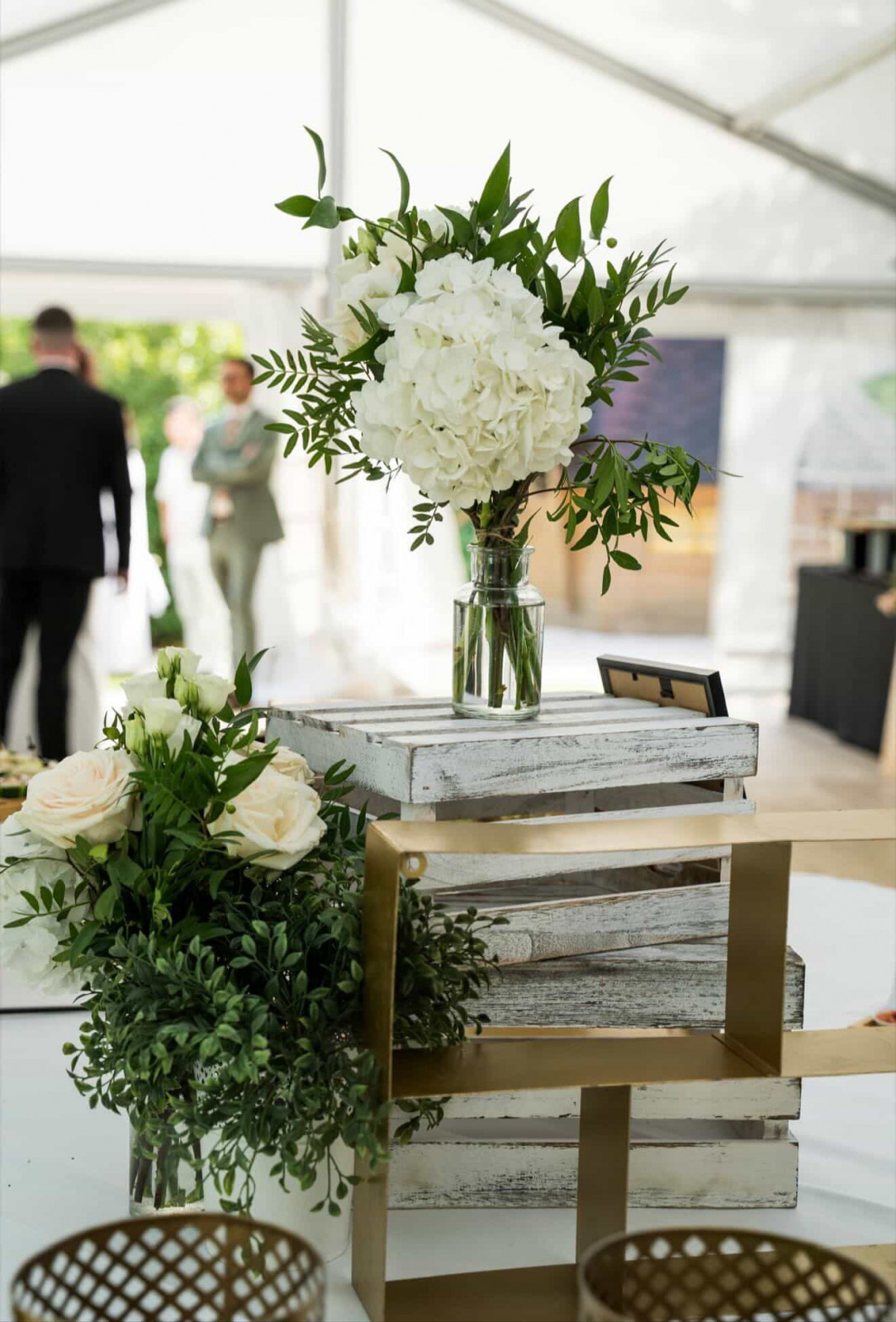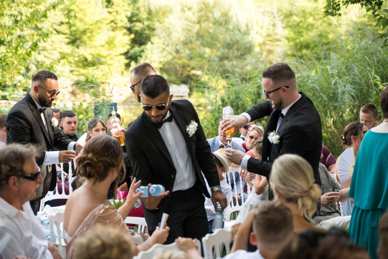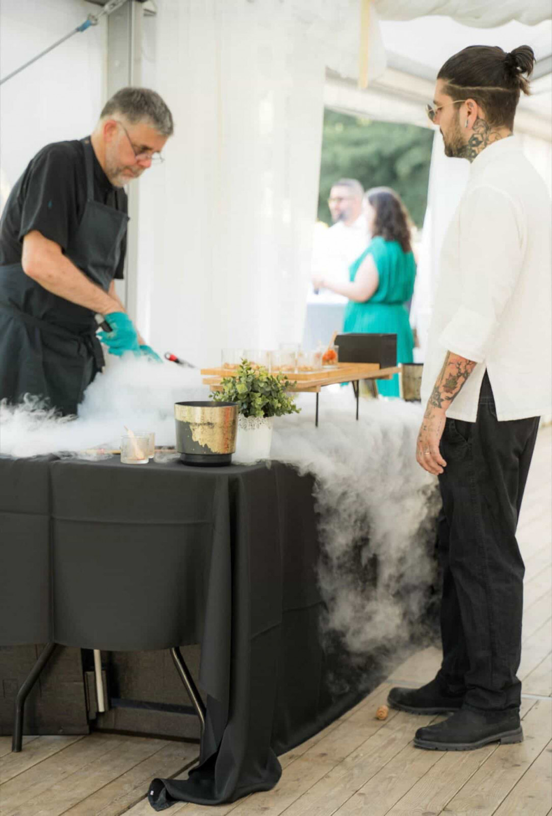 Le vin d’honneur, tout comme le repas était préparé et servi par le traiteur La Palette. Des pièces variées, colorées et excellentes. Avec en plus une animation plancha avec des mini-brochettes cuites à la minute. Et un azote show qui offrait un superbe spectacle mais aussi de succulentes verrines ! Les mariés avaient également opté pour un mur à bulles, que je n’ai malheureusement pas en photo. Un mur végétal, une clochette : on sonne et on nous offre une coupe de Champagne ! Côté déco, pas besoin d’en faire trop car les buffets étaient magnifiques. Nous avons juste ajouté quelques bouquets dans les tons blancs pour apporter une touche fleurie et rappeler le thème. En résumé, un moment convivial, sous le soleil, dont les mariés ont pu profiter pleinement car ils avaient réalisé les photos de groupe en amont.