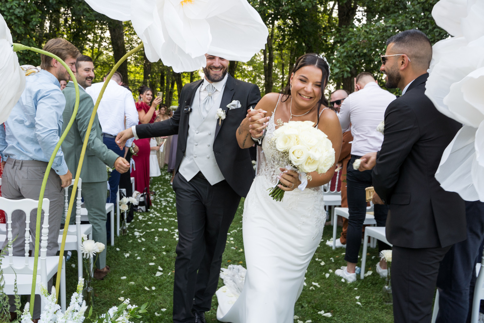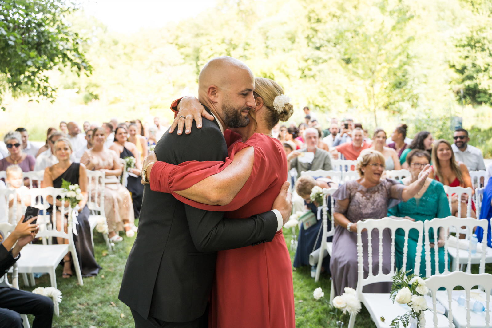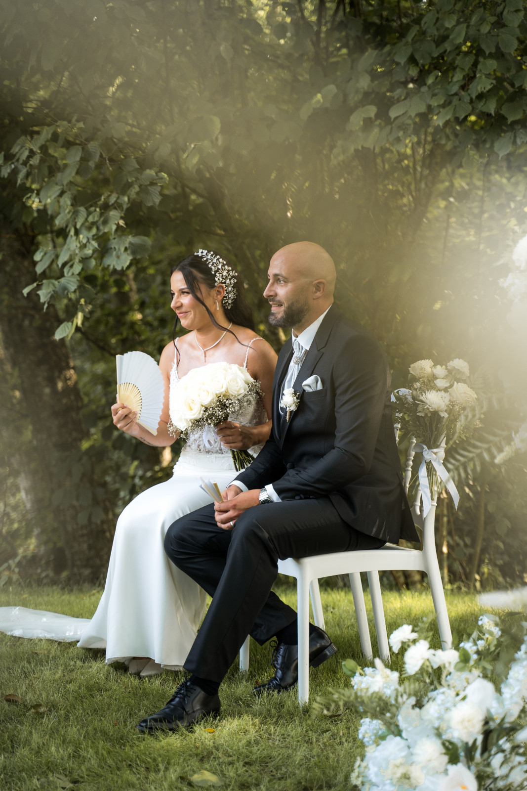 Un mélange de rires, de larmes, d’émotions et bien sûr de sincérité. La cérémonie s’est terminée avec l’échanges des vœux et des alliances. Toujours mon moment préféré ! Et pour une fois, je n’officiais pas alors j’ai pu suivre quelques moments clés de la cérémonie 😊 Puis place aux festivités avec la sortie des mariés sous les pétales de fleurs. Côté mise en place, la cérémonie était installée dans un espace ombragé, à côté de l’étang. La décoration était simple mais chic : des chaises Napoléon blanches, des fleurs géantes pour marquer l’arrivée puis une alternance de bouquets au sol et sur les chaises pour délimiter l’allée. Et une arche déstructurée mise en valeur par des colonnes dorées, qui ajoute une touche de modernité et contraste avec les arches que l’on a l’habitude de voir. Petit détail supplémentaire : des éventails et quelques ombrelles pour parer à la chaleur ambiance.