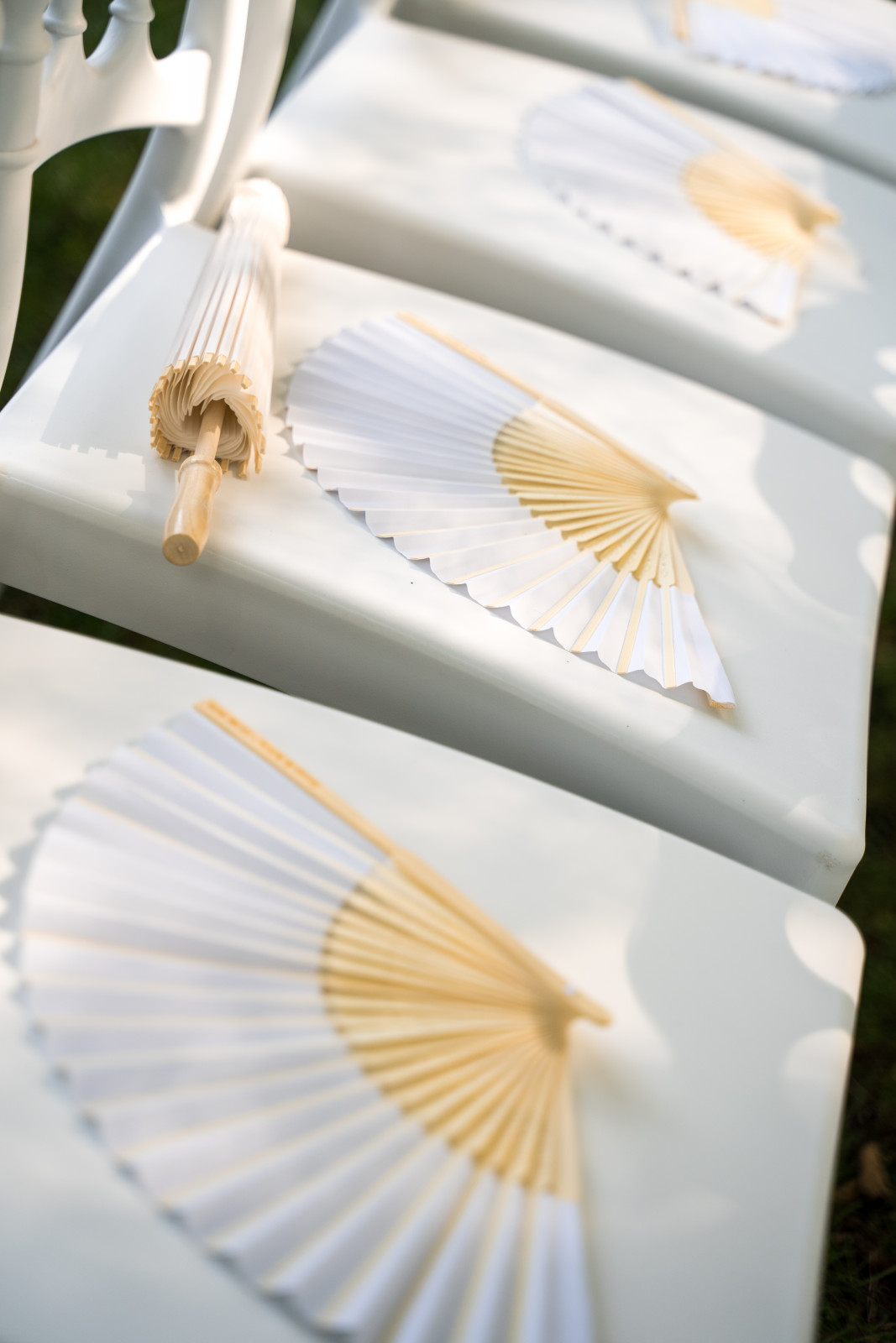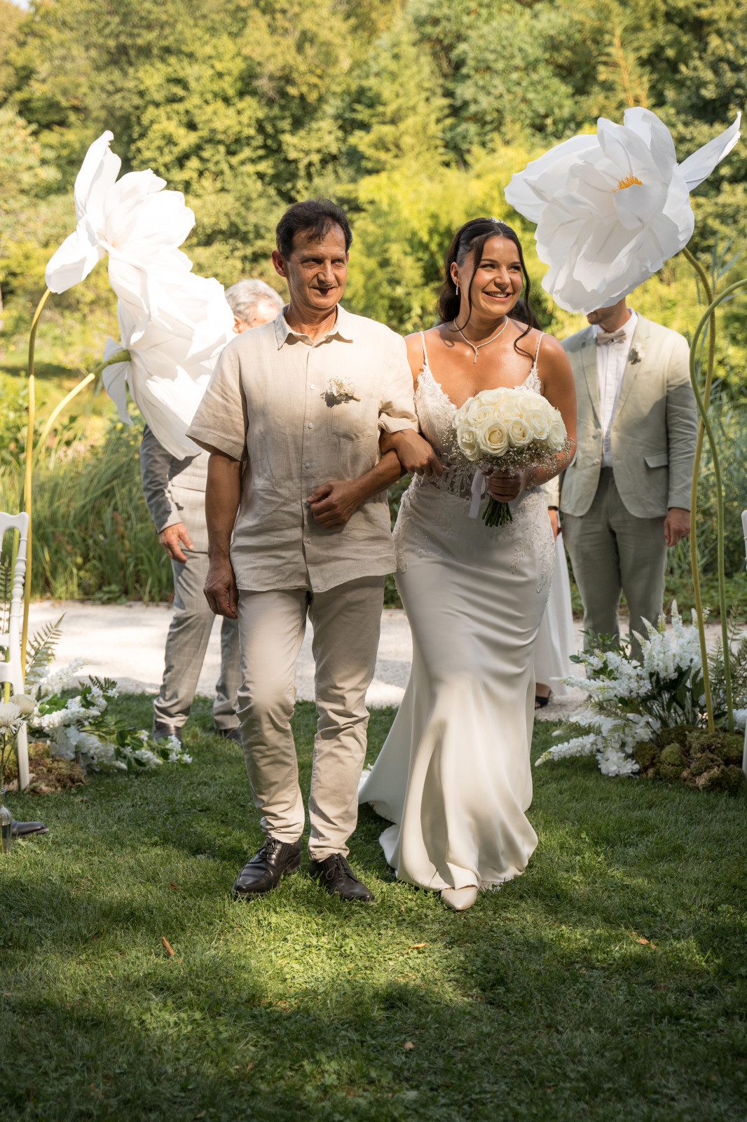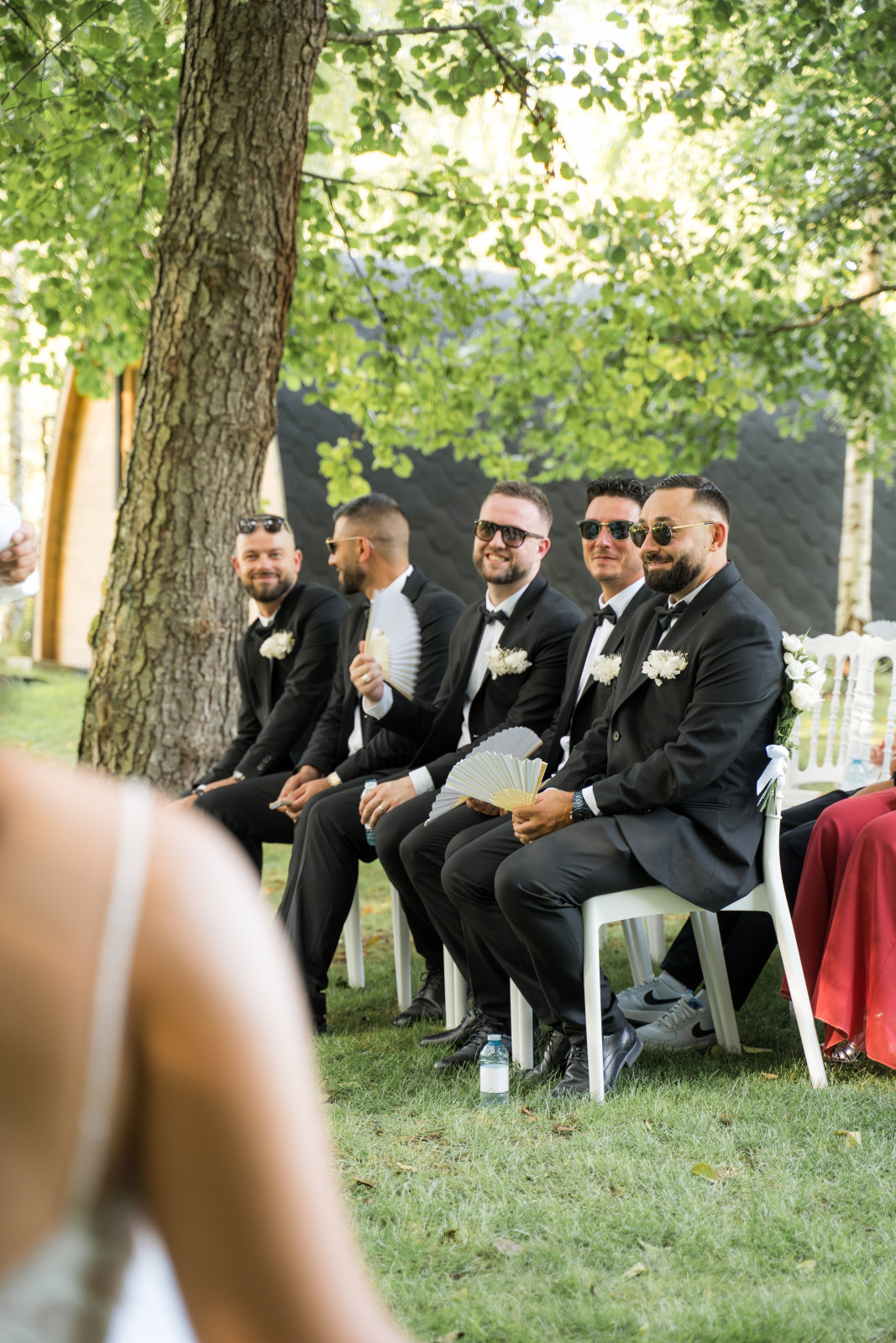 Un mélange de rires, de larmes, d’émotions et bien sûr de sincérité. La cérémonie s’est terminée avec l’échanges des vœux et des alliances. Toujours mon moment préféré ! Et pour une fois, je n’officiais pas alors j’ai pu suivre quelques moments clés de la cérémonie 😊 Puis place aux festivités avec la sortie des mariés sous les pétales de fleurs. Côté mise en place, la cérémonie était installée dans un espace ombragé, à côté de l’étang. La décoration était simple mais chic : des chaises Napoléon blanches, des fleurs géantes pour marquer l’arrivée puis une alternance de bouquets au sol et sur les chaises pour délimiter l’allée. Et une arche déstructurée mise en valeur par des colonnes dorées, qui ajoute une touche de modernité et contraste avec les arches que l’on a l’habitude de voir. Petit détail supplémentaire : des éventails et quelques ombrelles pour parer à la chaleur ambiance.