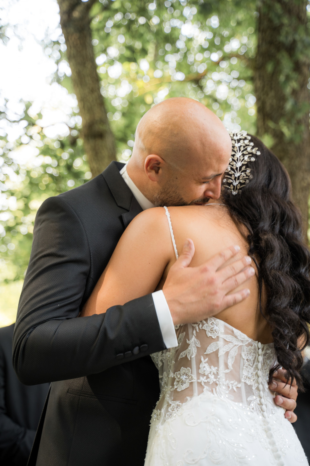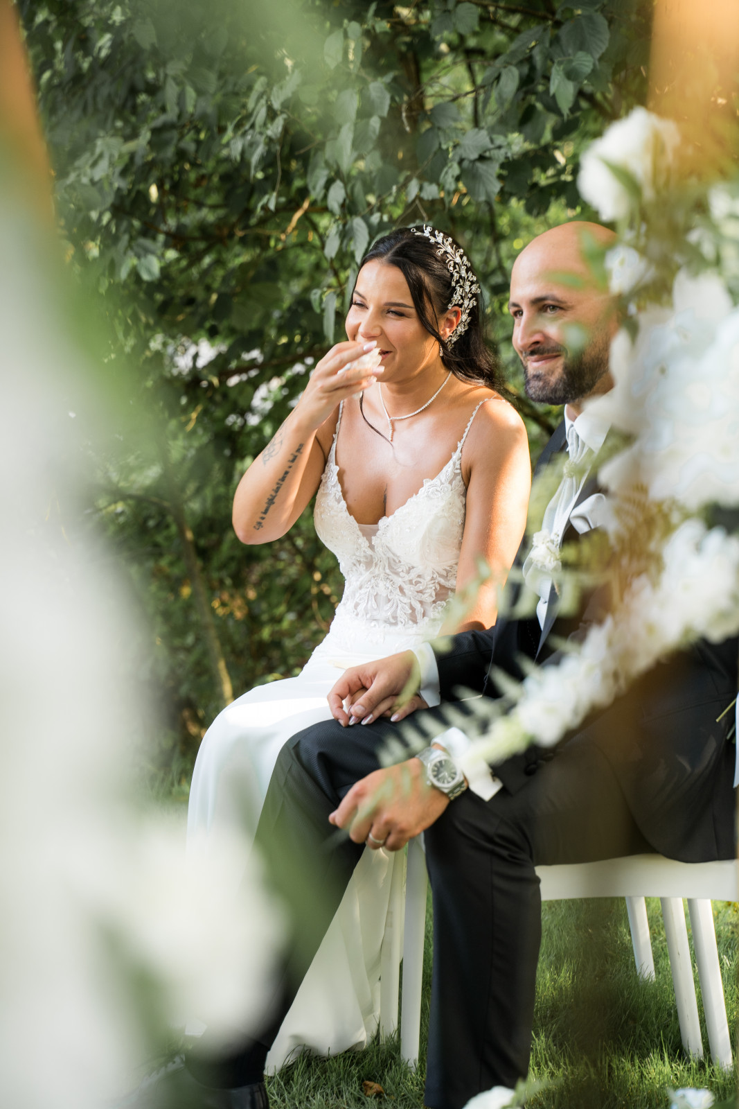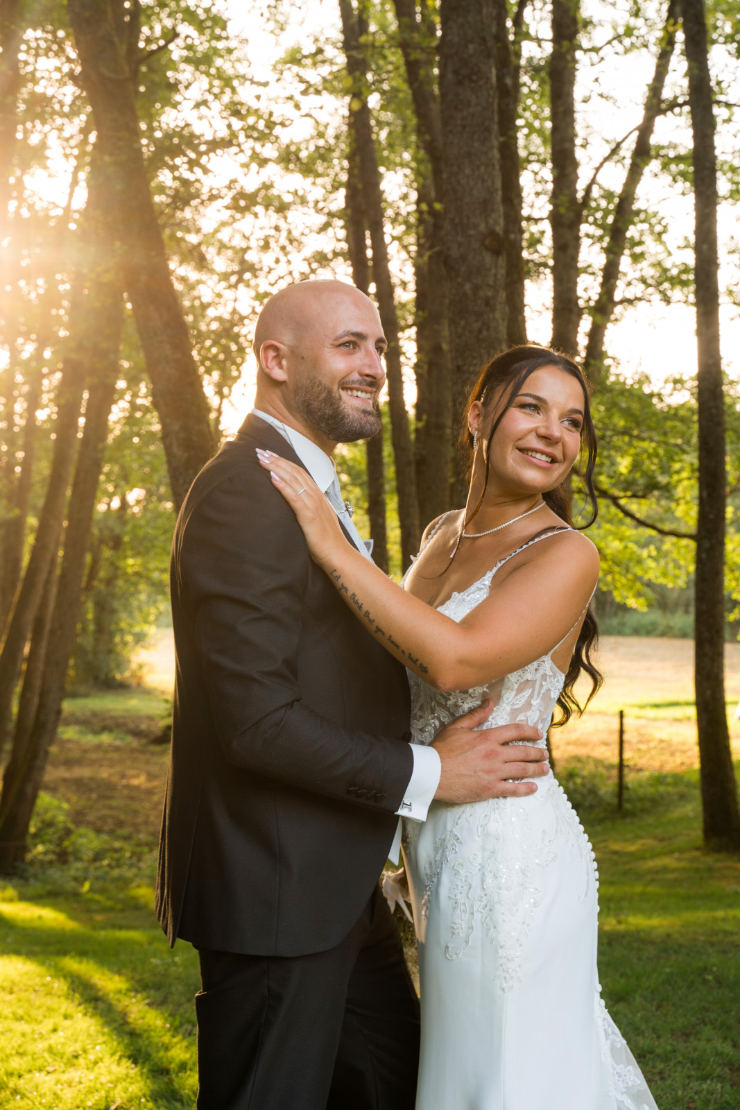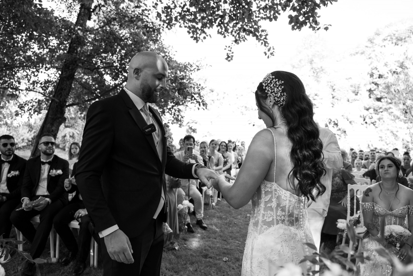Lors de ce mariage au Moulin de la Mangue, en Haute-Saône, les préparatifs ont lieu séparément pour nos mariés. Jenna travaillant dans l’esthétique, elle a géré la mise en beauté avec des amies de confiance. Elle a choisi une coiffure qui permet de mettre son visage en valeur tout en montrant sa longueur et en conservant un aspect naturel. Le bijou ajoute un côté chic. Côté maquillage, on mise également sur le naturel ce qui met en valeur ses jolis yeux. Les mariés n’ont pas souhaité de séance first look car ils voulaient se découvrir lors de la cérémonie laïque ! Et pour lancer la cérémonie dans la bonne humeur, on a pu compter sur les garçons d’honneur qui ont distribué des rafraichissements à l’assemblée. Le cortège est ensuite arrivé, clôturé par Jenna et l’émotion est tout de suite montée. La cérémonie a été officiée par un proche des mariés.