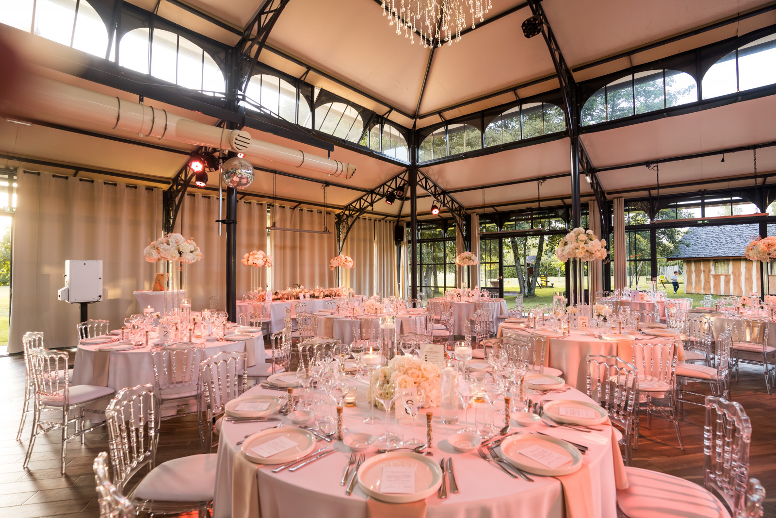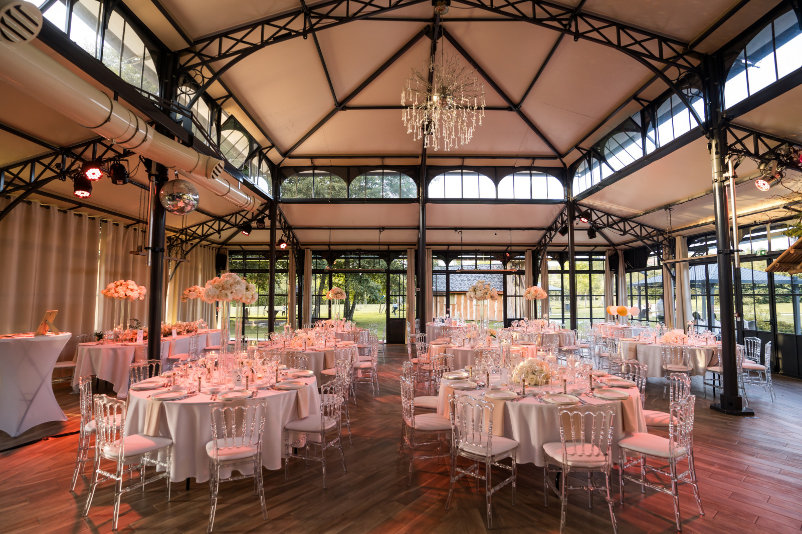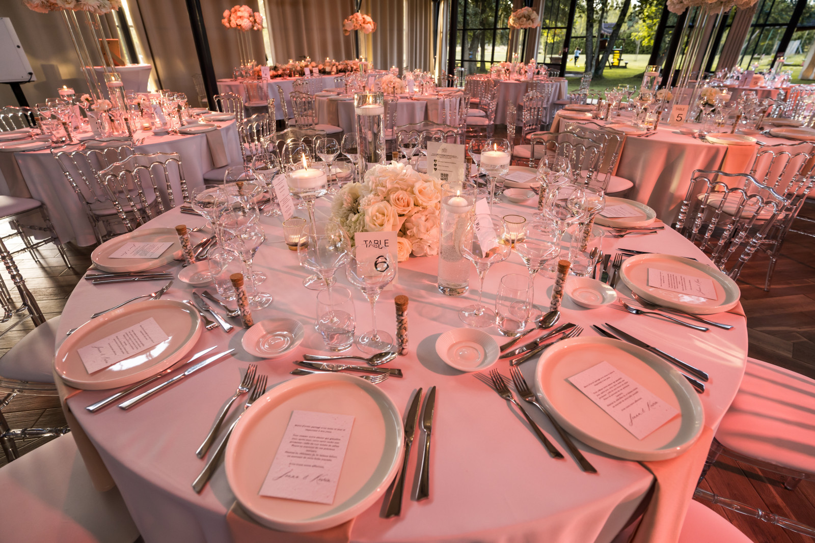 Passons maintenant à la décoration du mariage de Jenna & Kévin au Moulin de la Mangue, en Haute-Saône ! Comme je le dis toujours : quand on a une salle telle que l’Orangerie, pas besoin d’en faire trop. Il faut se concentrer sur la décoration de table. On a suivi la direction suivante : nuances de blanc, chic et transparence, en collaboration avec Clauday Evénements pour les locations. Pour les centres de table, les compositions florales sont en alternance haute & basse une table sur deux. Des compositions dans les teintes blanches, réalisées, tout comme les fleurs de la cérémonie laïques et les bouquets du vin d’honneur, par Atelier Fleuri. Colonne plexi pour les compositions en hauteur, photophores tube et sur pied en transparence avec des bougies flottantes pour ajouter une touche d’élégance et de lumière à la décoration de ce mariage en Haute-Saône.