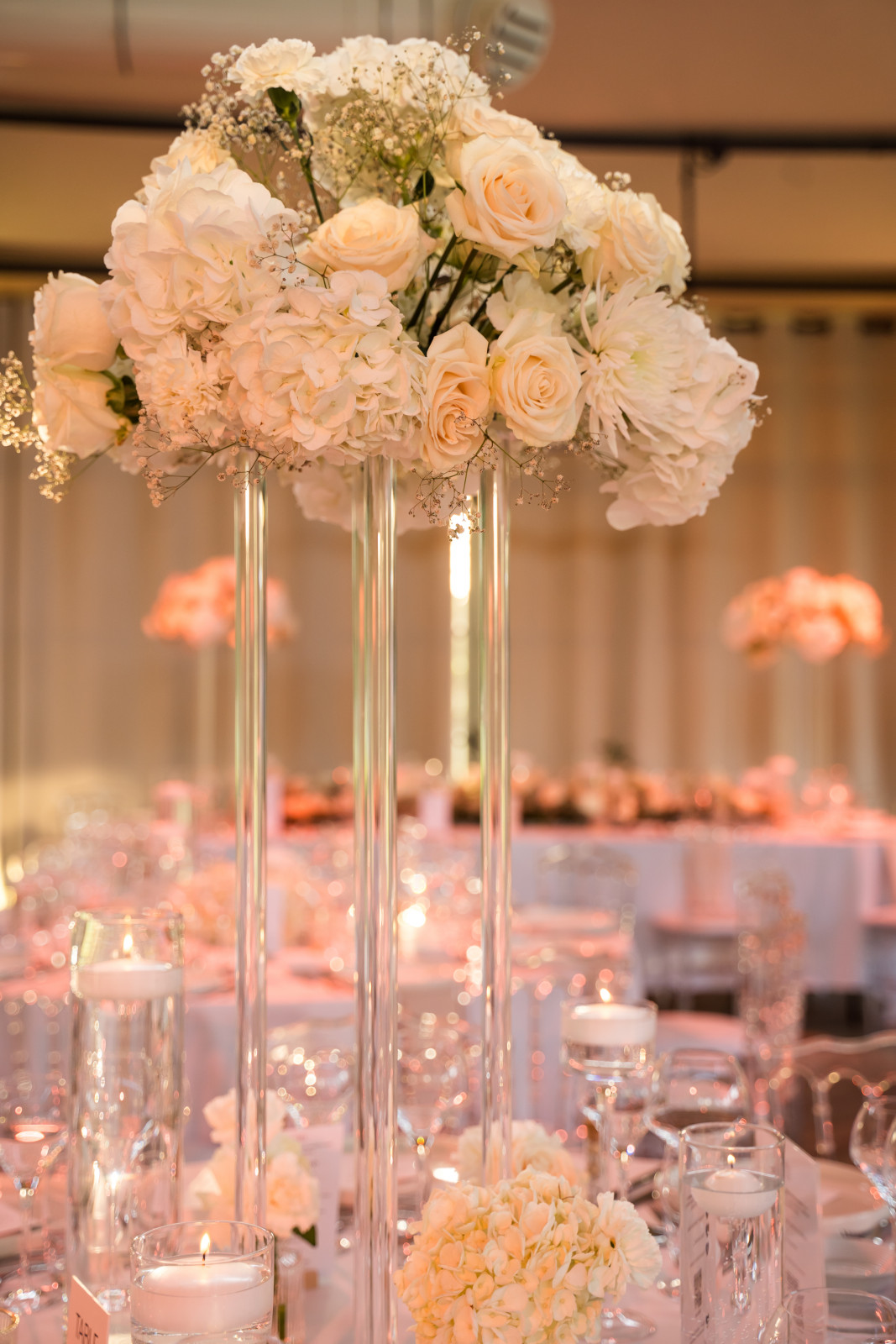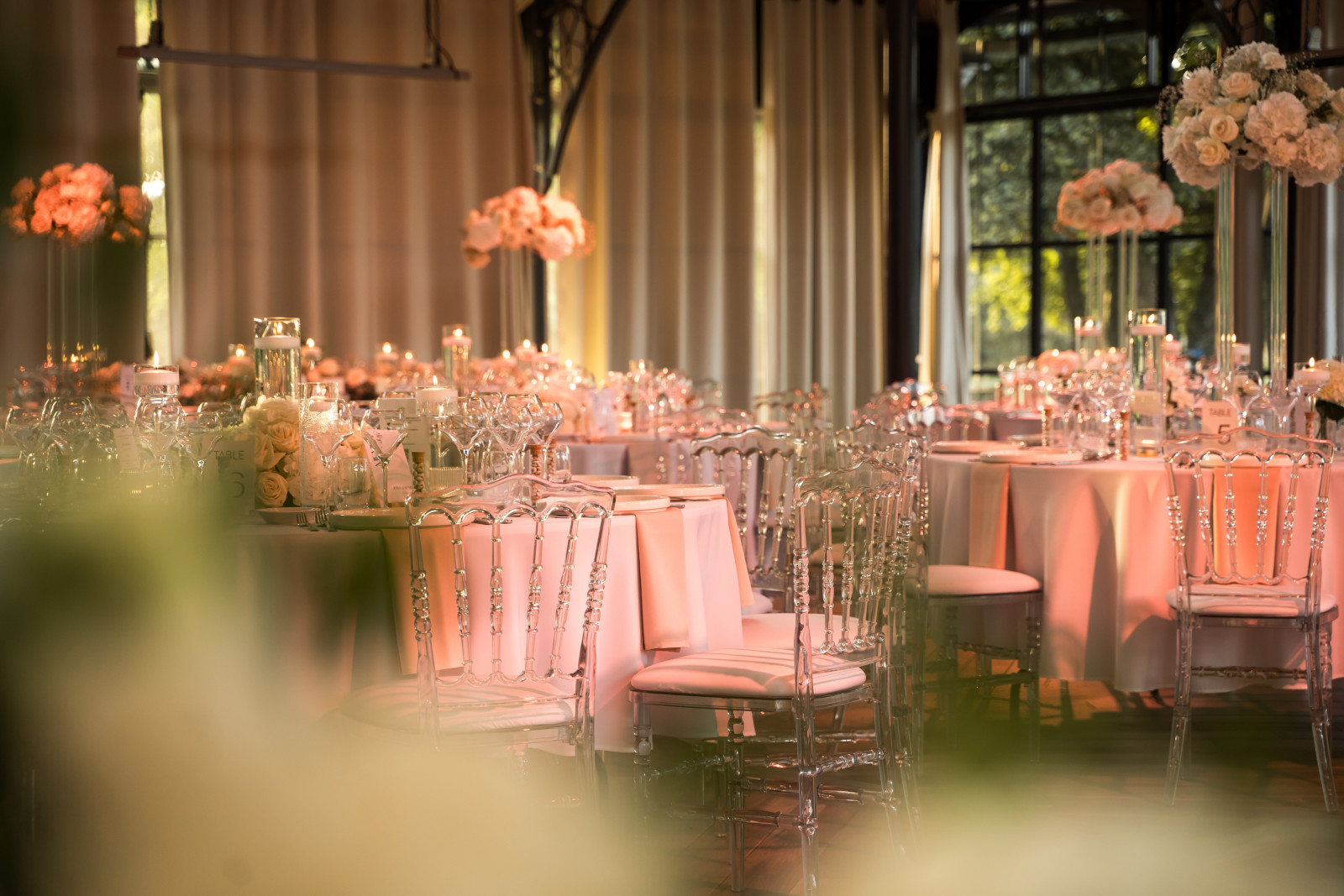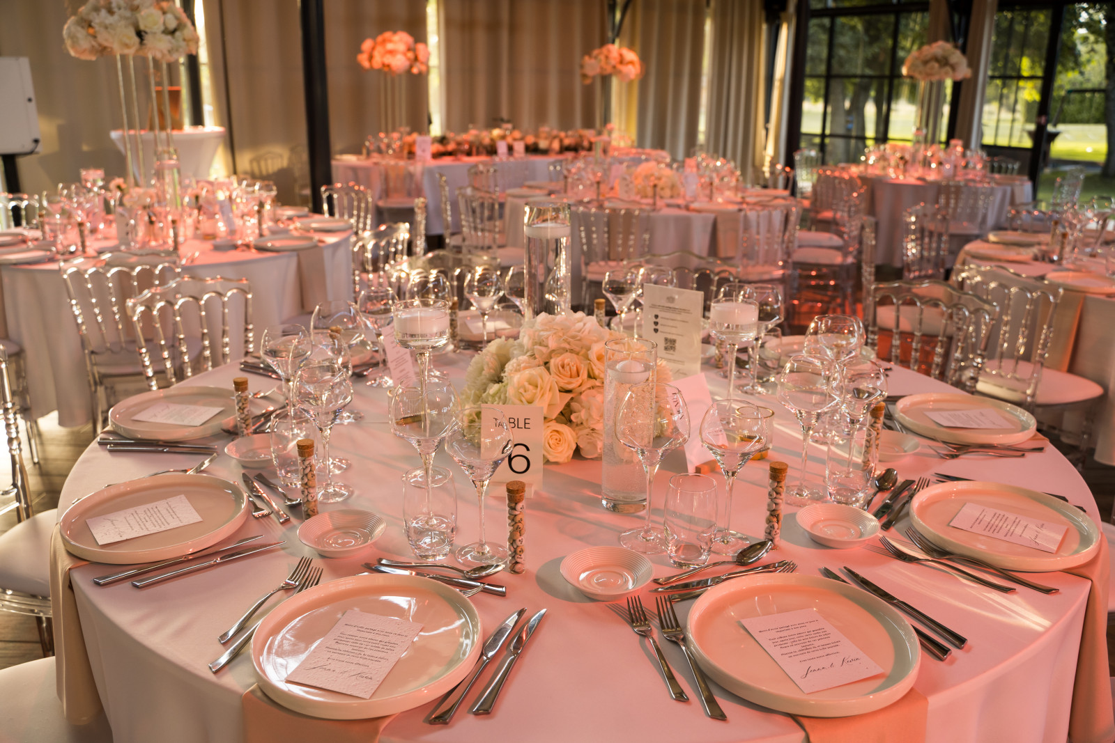 Passons maintenant à la décoration du mariage de Jenna & Kévin au Moulin de la Mangue, en Haute-Saône ! Comme je le dis toujours : quand on a une salle telle que l’Orangerie, pas besoin d’en faire trop. Il faut se concentrer sur la décoration de table. On a suivi la direction suivante : nuances de blanc, chic et transparence, en collaboration avec Clauday Evénements pour les locations. Pour les centres de table, les compositions florales sont en alternance haute & basse une table sur deux. Des compositions dans les teintes blanches, réalisées, tout comme les fleurs de la cérémonie laïques et les bouquets du vin d’honneur, par Atelier Fleuri. Colonne plexi pour les compositions en hauteur, photophores tube et sur pied en transparence avec des bougies flottantes pour ajouter une touche d’élégance et de lumière à la décoration de ce mariage en Haute-Saône.