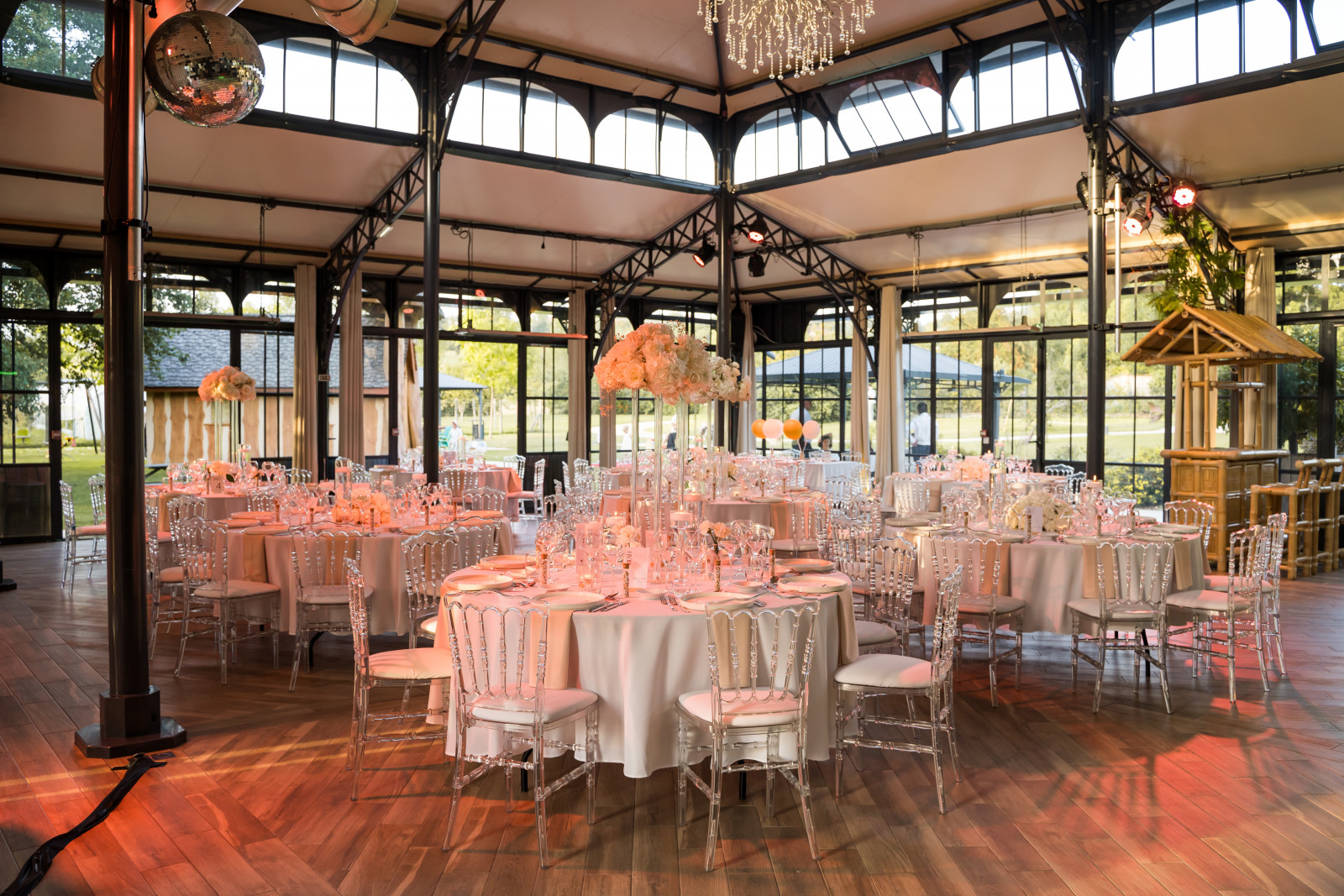 Des serviettes beiges pour ajouter une touche de couleur tout en respectant la palette imposée. De la verrerie élégante, des assiettes modernes, ainsi que des numéros de table et menus blancs viennent compléter la table. Et on a opté pour des chaises Napoléon plexi qui permettent de conserver une belle transparence. Pour la table d’honneur, un chemin de table fleuri s’allonge sur toute la longueur de la table et apporte une élégance supplémentaire. A l’entrée de l’Orangerie, on retrouve l’espace panneau de bienvenue XXL & plan de table. Ils restent dans les tons souhaités et sont mis en valeur par une partie des fleurs de la cérémonie, que l’on réutilise ici une seconde fois. Dans la salle, on retrouve également un candy bar, un espace photobooth, un bar à chaussons, un coin urne avec un joli livre d’or audio. Sans oublier le fameux bar à rhums du marié !